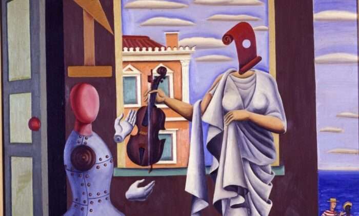 Ποιητής και Μούσα, 1958, Αθήνα, Εθνική Πινακοθήκη. Έργο του Νίκου Εγγονόπουλου [21 Οκτωβρίου 1907 – 31 Οκτωβρίου 1985]. Ο Νίκος Εγγονόπουλος υπήρξε λογοτέχνης, μεταφραστής, ζωγράφος, αγιογράφος και σκηνογράφος. Η πρώτη του εμφάνιση στον καλλιτεχνικό χώρο πραγματοποιήθηκε το 1938 με την παρουσίαση ζωγραφικών έργων του στα πλαίσια της έκθεσης Τέχνη της Νεοελληνικής Παραδόσεως.