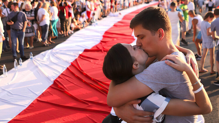 Δύο διαδηλωτές φιλούν κατά τη διάρκεια αντικυβερνητικών διαδηλώσεων στη Λευκορωσία. 16 Αυγούστου 2020.
