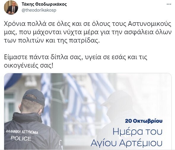 Τιμώντας τις ελληνοχριστιανικές παραδόσεις μας δεν μπορεί να μην κάνουμε αναφορά ότι σήμερα για επικρατούσα θρησκεία είναι η γιορτή του Αγίου Αρτεμίου. Κάτι που προφανώς δεν διέφυγε της προσοχής του υπουργού Προστασίας του Πολίτη, ο οποίος θεώρησε υποχρέωση του να απευθύνει το παραπάνω μήνυμα στους ένστολους υφισταμένους του, αφού αυτός ο Αγιος θεωρείται προστάτης των αστυνομικών και των ... αρχιδιών! Ισως δεν διαθέτει το εορτολόγιο άλλον άγιο που να συνδυάζει τόσο καλά αυτά που ανέλαβε υπό την προστασία του.