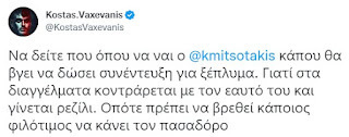 Είχαμε τον δικό μας "προφήτη", τον Ζαραλίκο, μας προέκυψε και δεύτερος. Η μαντεψιά, αυτή την φορά προέρχεται από τον Κώστα Βαξεβάνη. Δεν πέρασαν παρά ελάχιστες ώρες που έκανε την εκτίμηση που διαβάζουμε στο τουιτ που παραθέτουμε ο εκδότης του Documento και η επιβεβαίωση ήρθε με την είδηση ότι αύριο ο Μητσοτάκης δίνει -μάλλον μαγνητοσκοπημένη- συνέντευξη στον "πασαδόρο" Νίκο Χατζηνικολάου. (Φαντάζεστε πόσες ώρες θα καταναλωθούν για να προετοιμαστεί!)