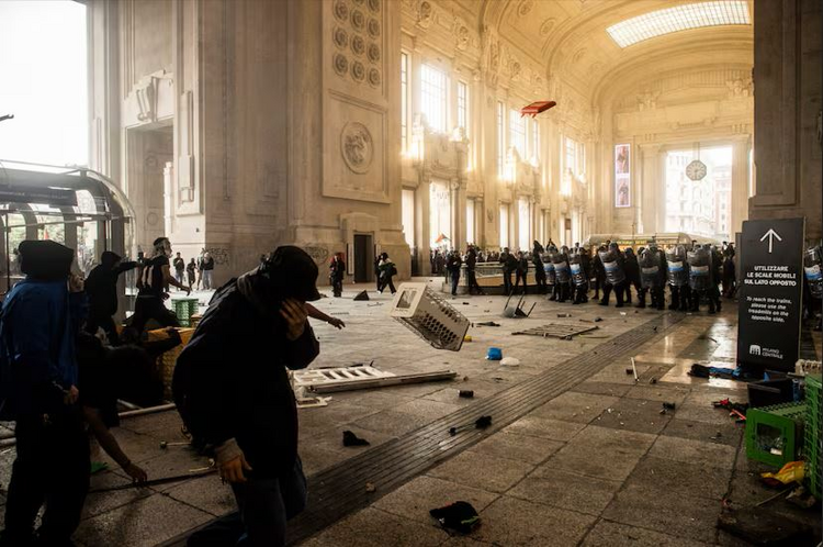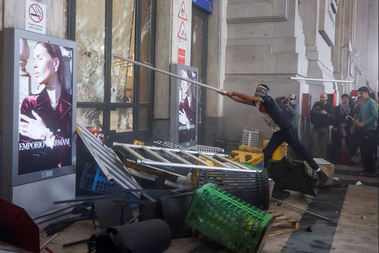 Στις 22 Σεπτεμβρίου πραγματοποιήθηκε γενική απεργία στην Ιταλία σε ένδειξη αλληλεγγύης στους Παλαιστίνιους. Η απεργία προκάλεσε αναταραχές σε όλη τη χώρα, ενώ συγκρούσεις σημειώθηκαν στο Μιλάνο. Πολλοί διαδηλωτές προσπάθησαν να εισέλθουν στον κεντρικό σιδηροδρομικό σταθμό (Milano Centrale), έσπασαν τις τζαμαρίες, πέταξαν μπουκάλια και άλλα αντικείμενα και συγκρούστηκαν με την αστυνομία. Περίπου 60 αστυνομικοί τραυματίστηκαν, με 23 από αυτούς να χρειάζονται νοσηλεία, ενώ πάνω από 12 διαδηλωτές συνελήφθησαν. Γενικά η απεργία προκάλεσε προβλήματα σε όλη τη χώρα, με μεγάλες καθυστερήσεις στα τρένα και περιορισμένες δημόσιες συγκοινωνίες σε μεγάλες πόλεις, συμπεριλαμβανομένης της Ρώμης.